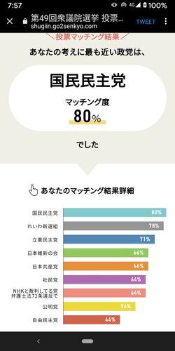 あなたの考えに最も近い政党は、国民民主党で、マッチング度は80%だった。 ちなみに令和新撰組とのマッチング度は78%。 う~ん(笑)。 もともと政治にも選挙にも無関心だったけれど、新型コロナウイルスについての政治のドタバタっぷりを見ていると、そんな…